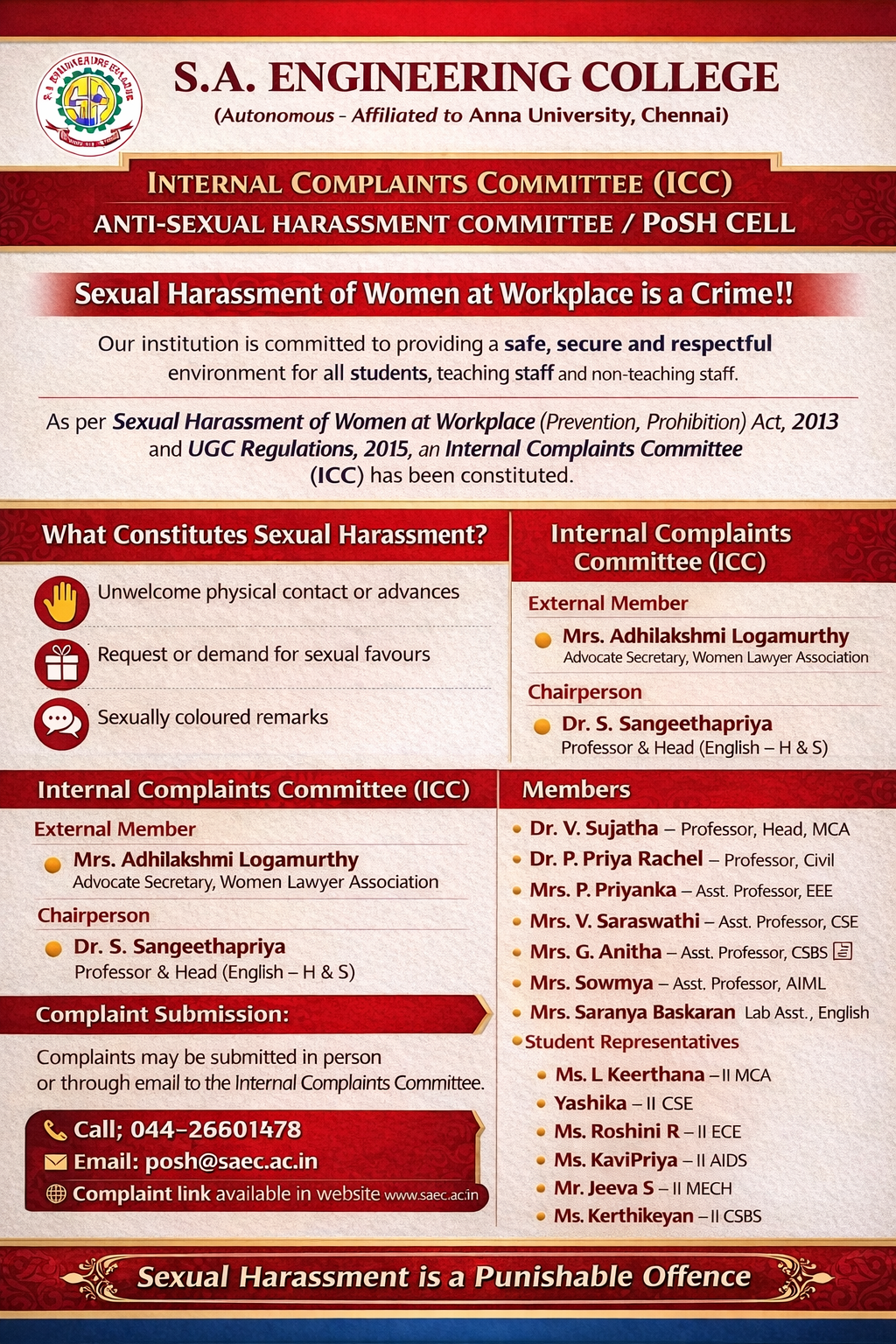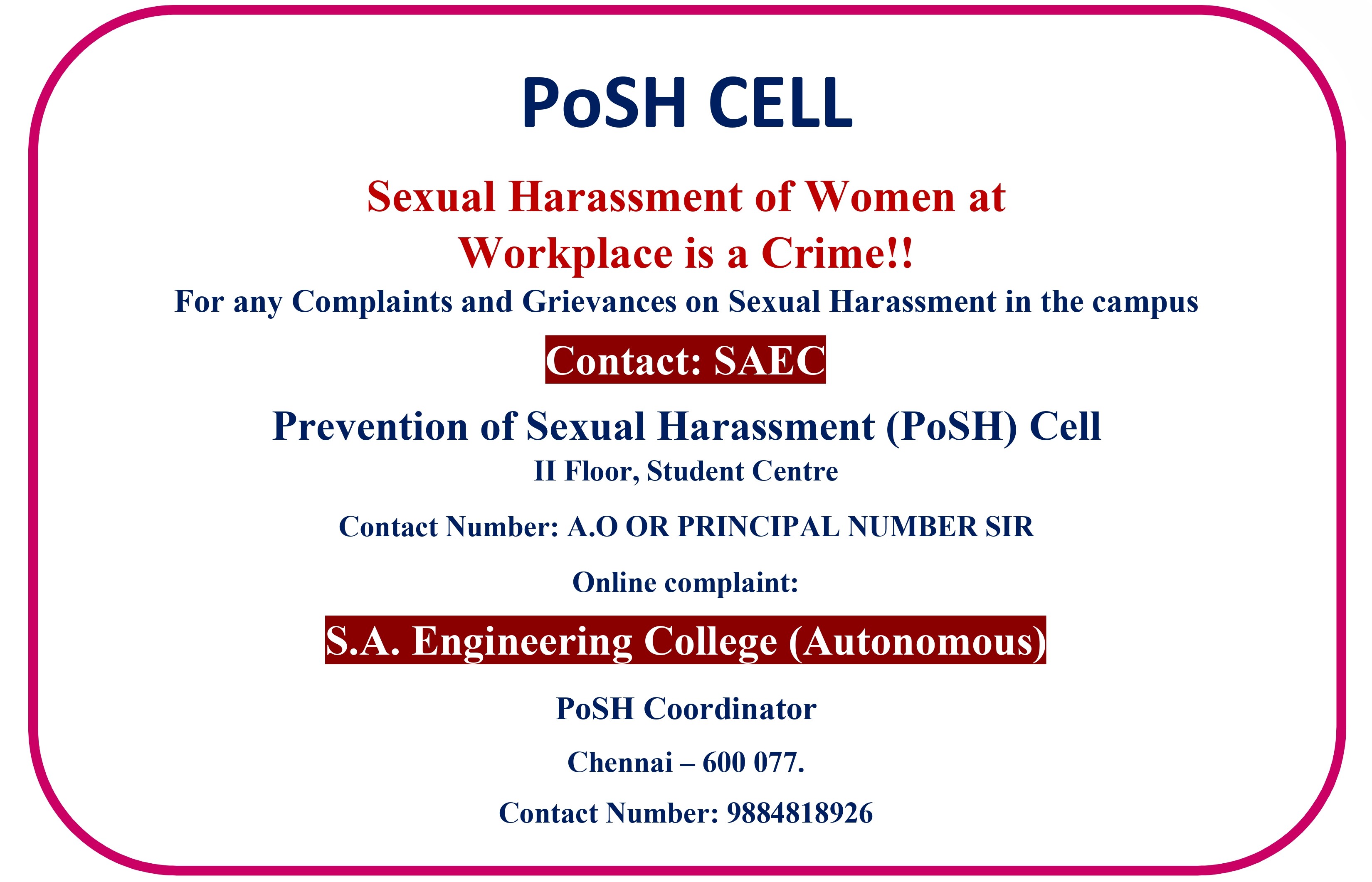 PoSH Cell, Anna University shall strive hard to build and maintain an atmosphere free of sexual violence, harassment, exploitation, and intimidation for teaching, non-teaching staff, and students by conducting continuous awareness programme to achieve sustainable humankind behavior in the work place.