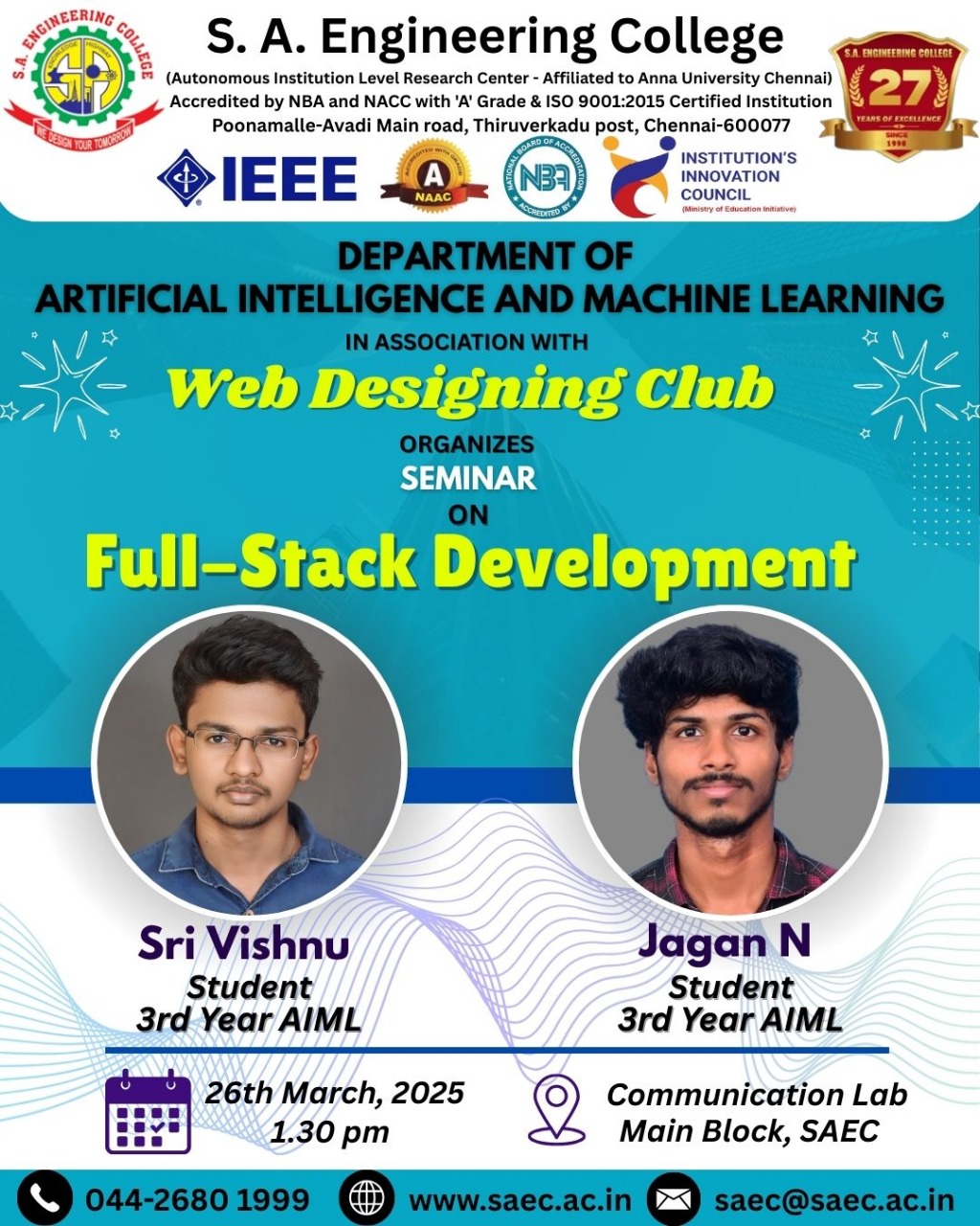 Department of CSE, CSE (AIML) & AIDS, IEEE Computer Society Student Branch, SAEC in Association with IEEE Computer Society Madras Chapter Organizes IEEE CS TECH SAVANTS CARNIVAL 24 – 29 April 2024 and 30 April 2024 – https://savants-carnival-24.vercel.app/