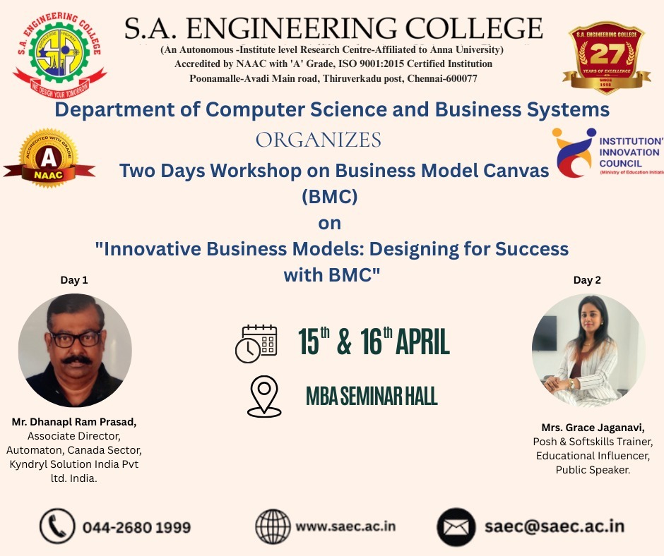 Department of Computer Science and Business Systems, in association with the Institution’s Innovation Council, is organizing Two Days Workshop for CSBS students. Two Days Workshop on Business Model Canvas (BMC) on “Innovative Business Models: Designing for Success with BMC”